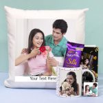 Personalized Romantic Surpise – Personalized White Mug, Personalized Cushion, Square Wooden Keychain, Dairy Milk Silk and Personalized Card